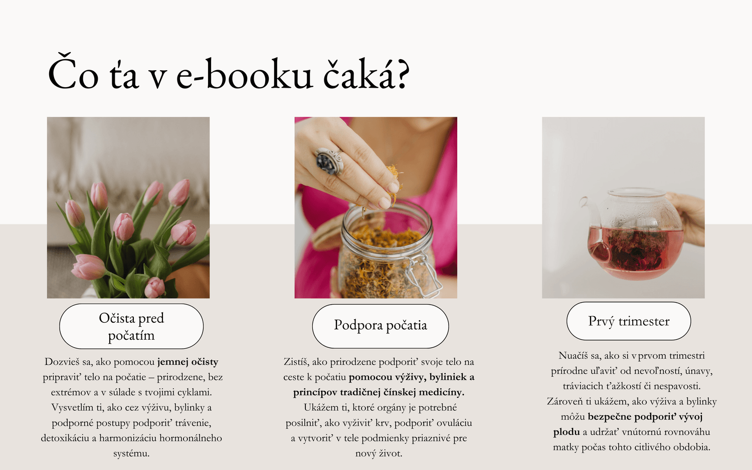 Tento e-book je sprievodcom, ktorý ti ukáže, ako podporiť svoje telo v troch citlivých obdobiach – od vedomej prípravy na nový život, cez starostlivosť počas tehotenstva až po láskyplné zotavenie po pôrode.